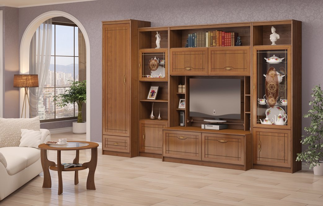 Состав композиции: 1 Шкаф для одежды «Лондон», 11 Шкаф-пенал «Лондон», 15 Секция комбинированная «Лондон», 14 Тумба для телеаппаратуры «Лондон», 12 Полка приставная к мод.15 «Лондон» (2 шт.), 13 Полка стекло (цвет бронза) «Лондон», 9 Шкаф для посуды «Лондон»